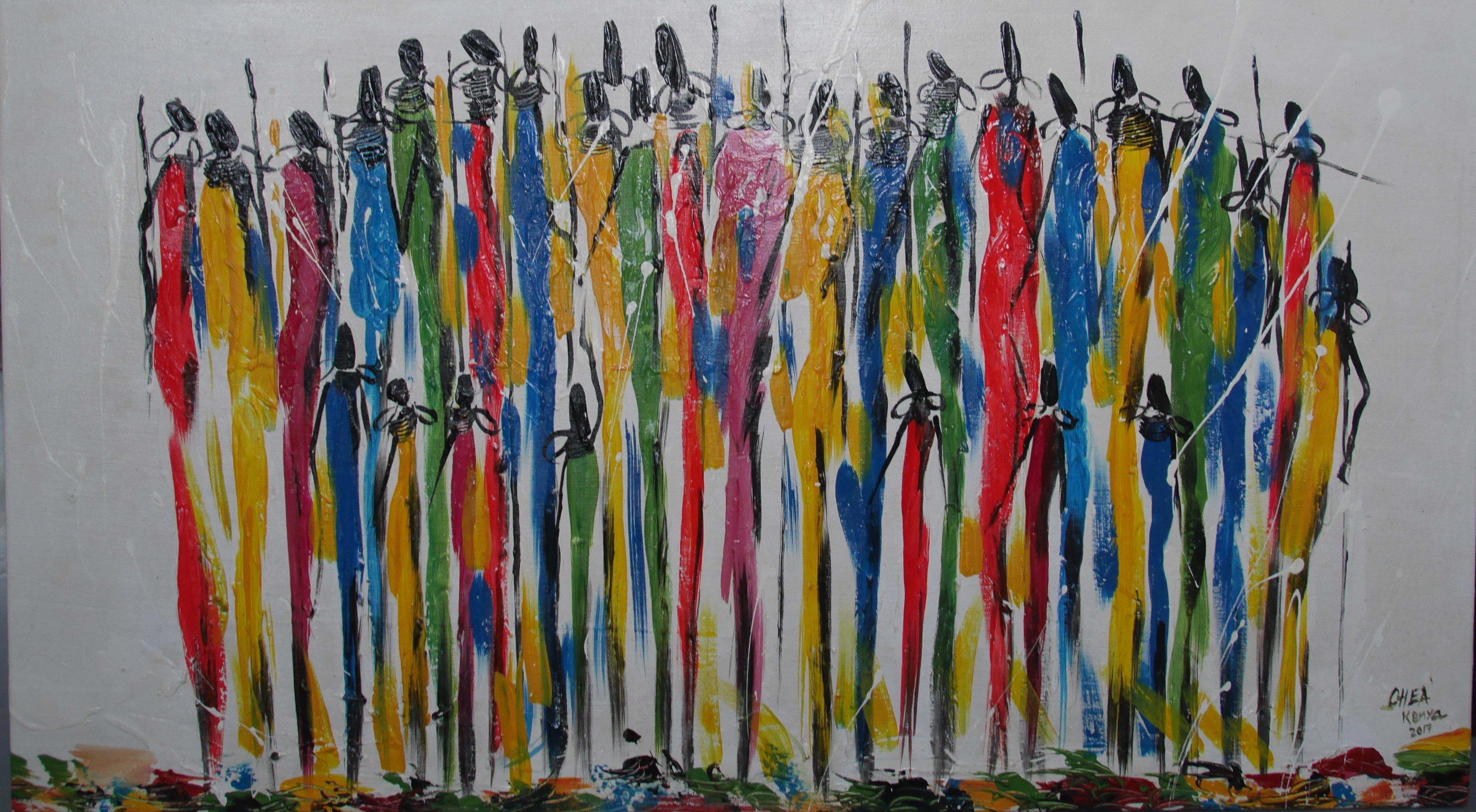 Schilderij - Masai groep in bonte kleuren op witte achtergrond