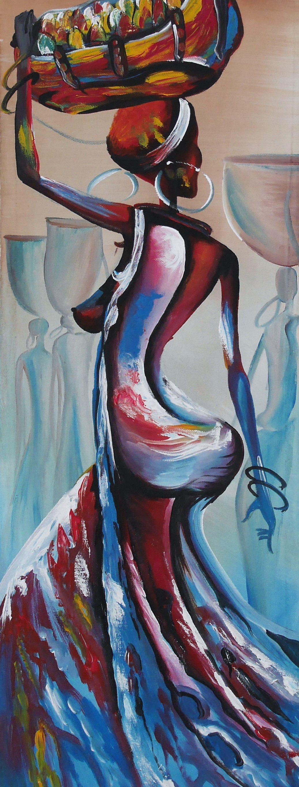 Schilderij - Afrikaanse dame met fruitschaal op hoofd