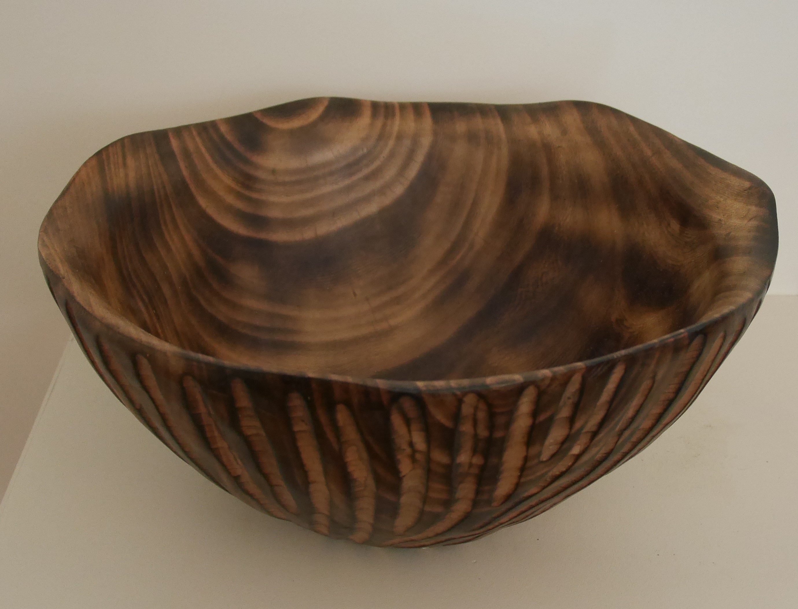 Met de hand uitgefreesde, ronde houten kom met aan de buitenzijde gestreepte, ingekerfde zebra patroon.