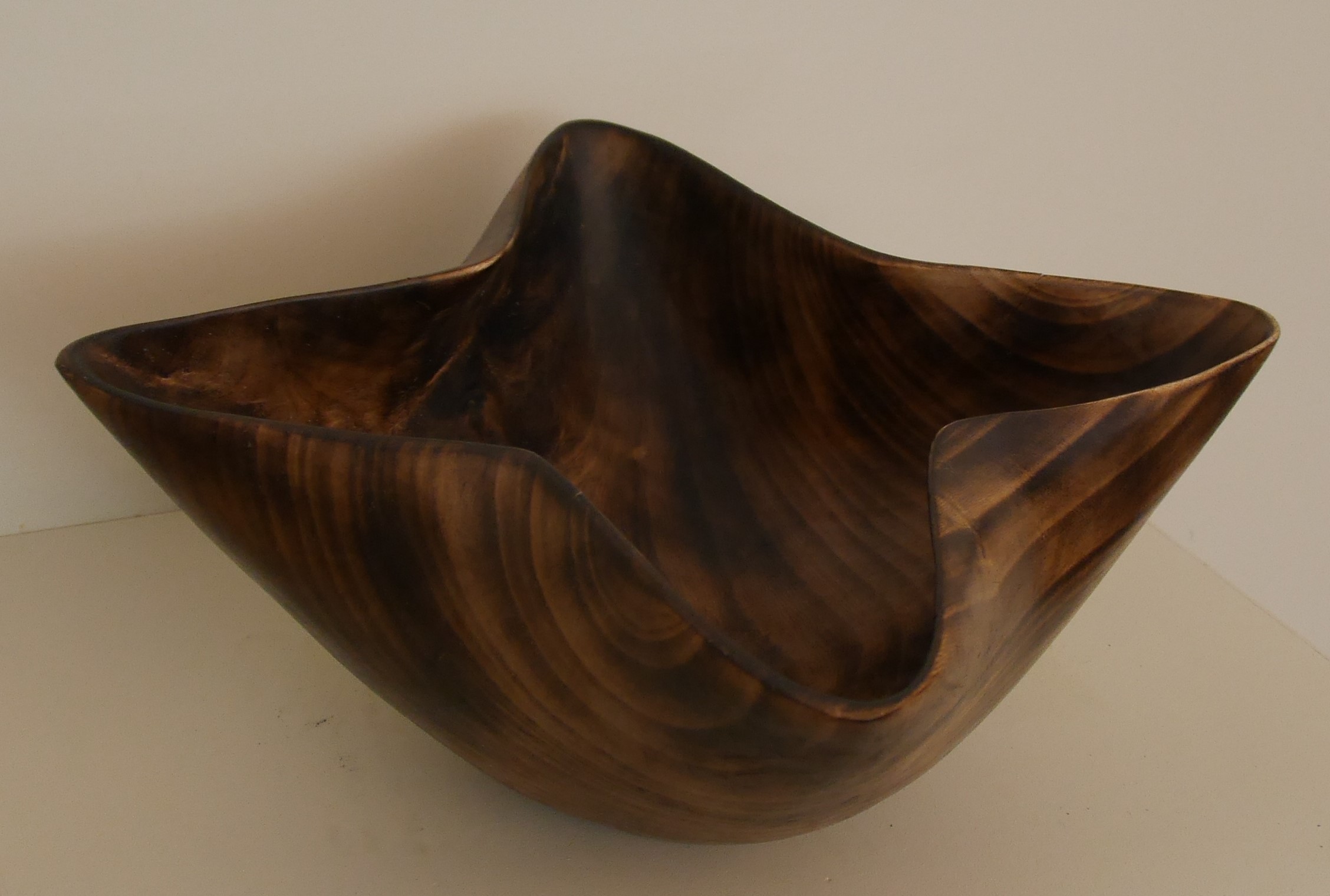 Met de hand uitgefreesde, vierkante houten kom met ingaande welving aan de vier zijden.