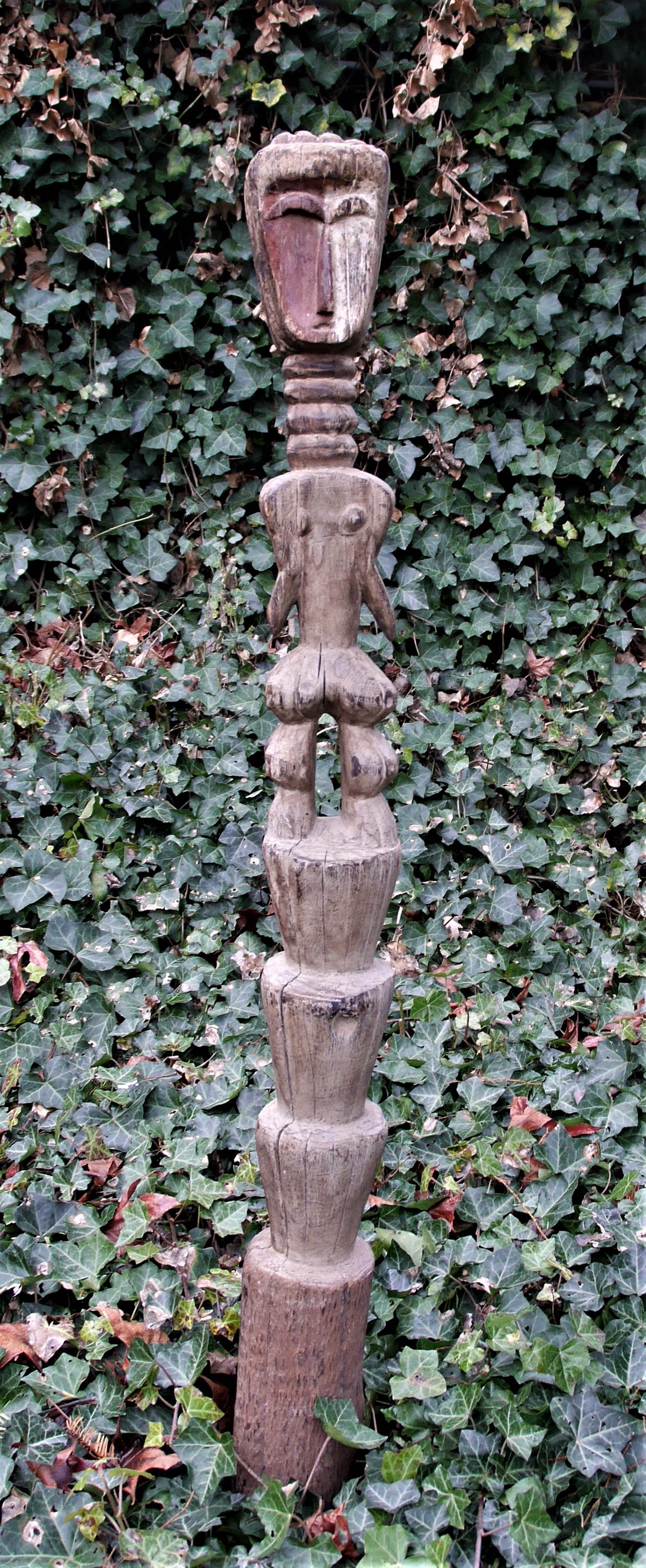 1. Het meest voorkomende type zijn eenvoudige houten palen, waarin schijfvormige, ronde onderverdelingen zijn ingesneden. Deze ‘schijven’ symboliseren het bezit van vee en de ‘winstfeesten’ die de overledene voor de gemeenschap heeft georganiseerd. Deze funeraire palen hebben enkel een gestileerde kop aan de bovenkant. (zie product nr. 20010022)