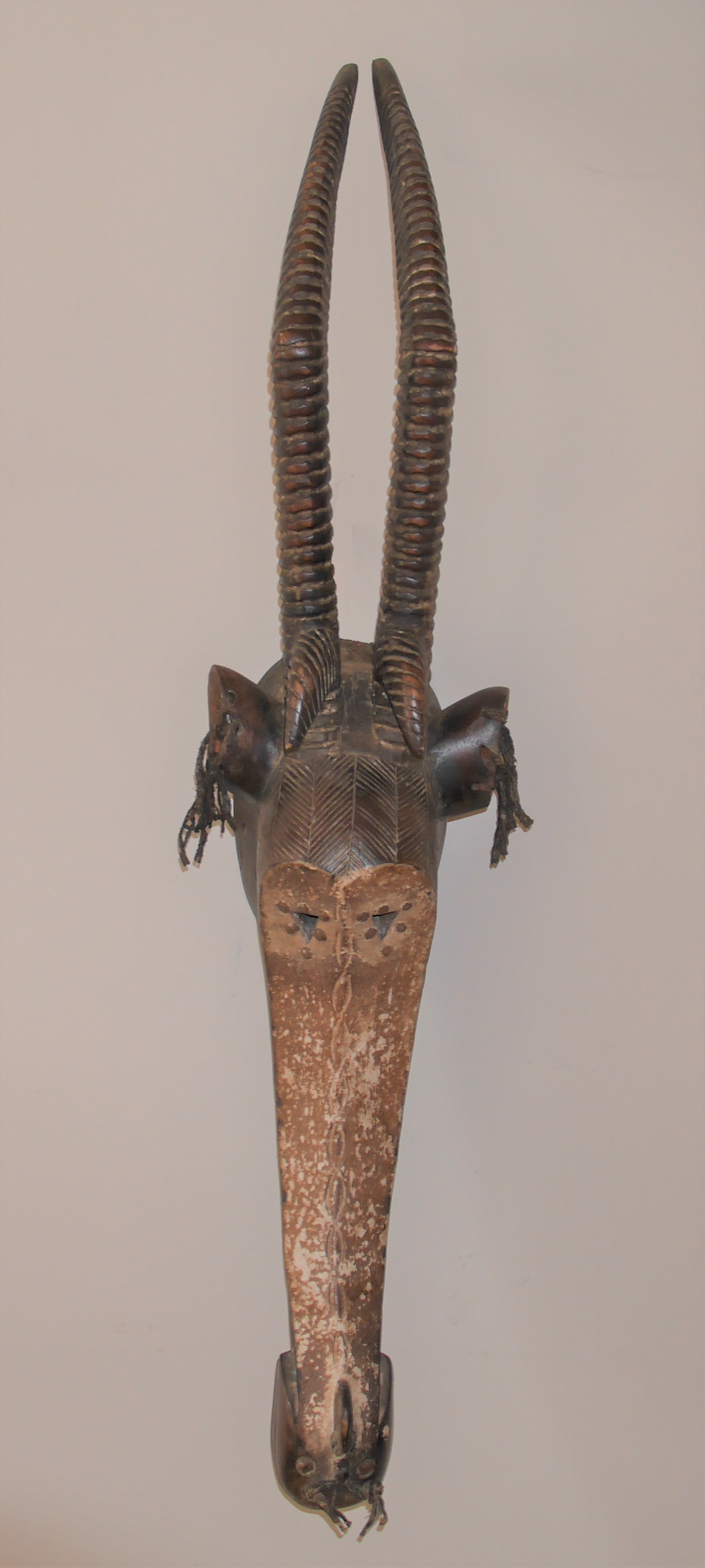 Deze antilopenmaskers zijn uit hout vervaardigd. De ogen en neus werden met spijkerkoppen geaccentueerd. Het aangezicht werd oorspronkelijk met witte klei gewit, maar is grotendeels door de tijd vergaan. Wit symboliseert de relatie met het nabestaan.