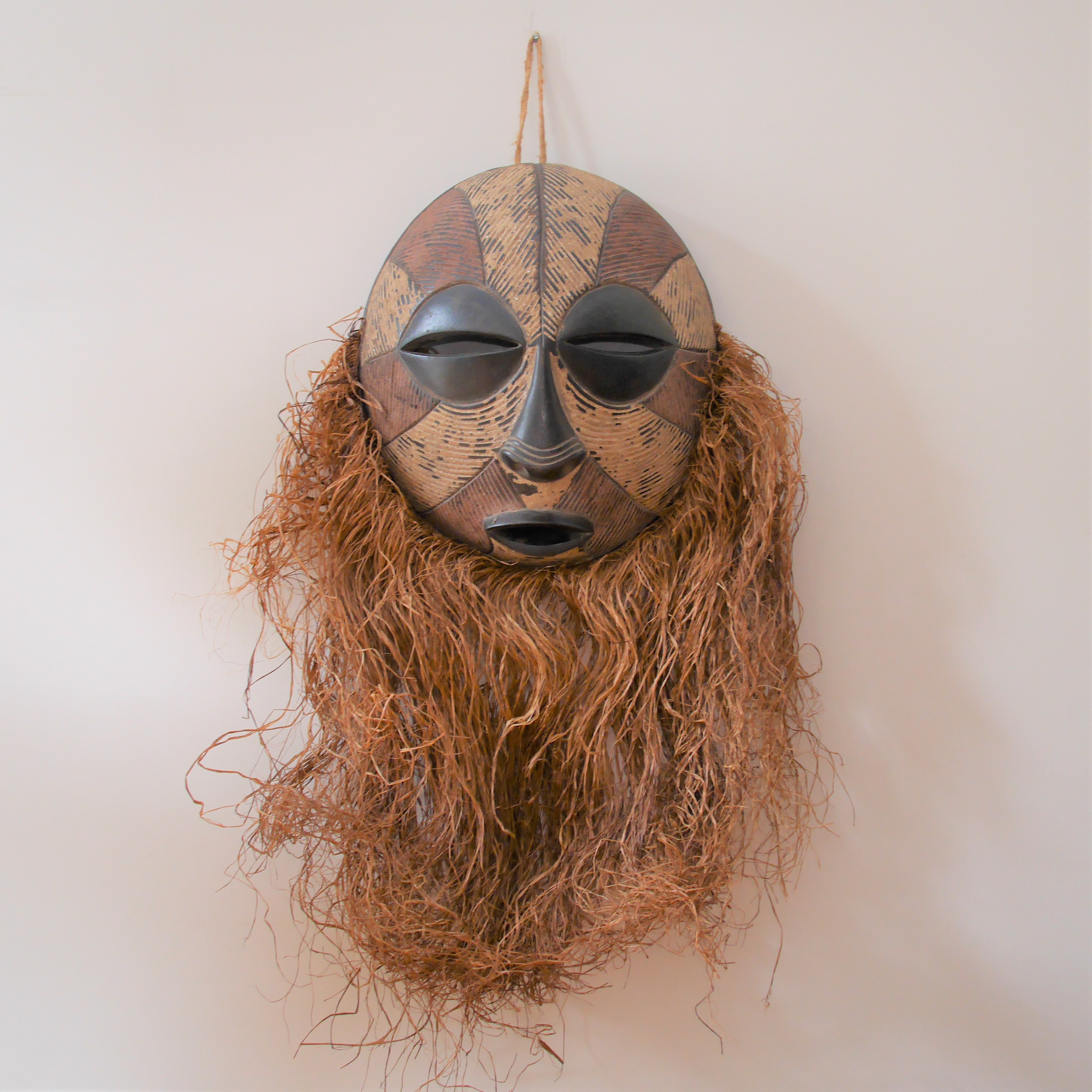 Een mooi uitgewerkt Afrikaans masker met een rond, lineair ingesneden gezicht en met goed bewaarde resten van witte en bruine kleiverf.