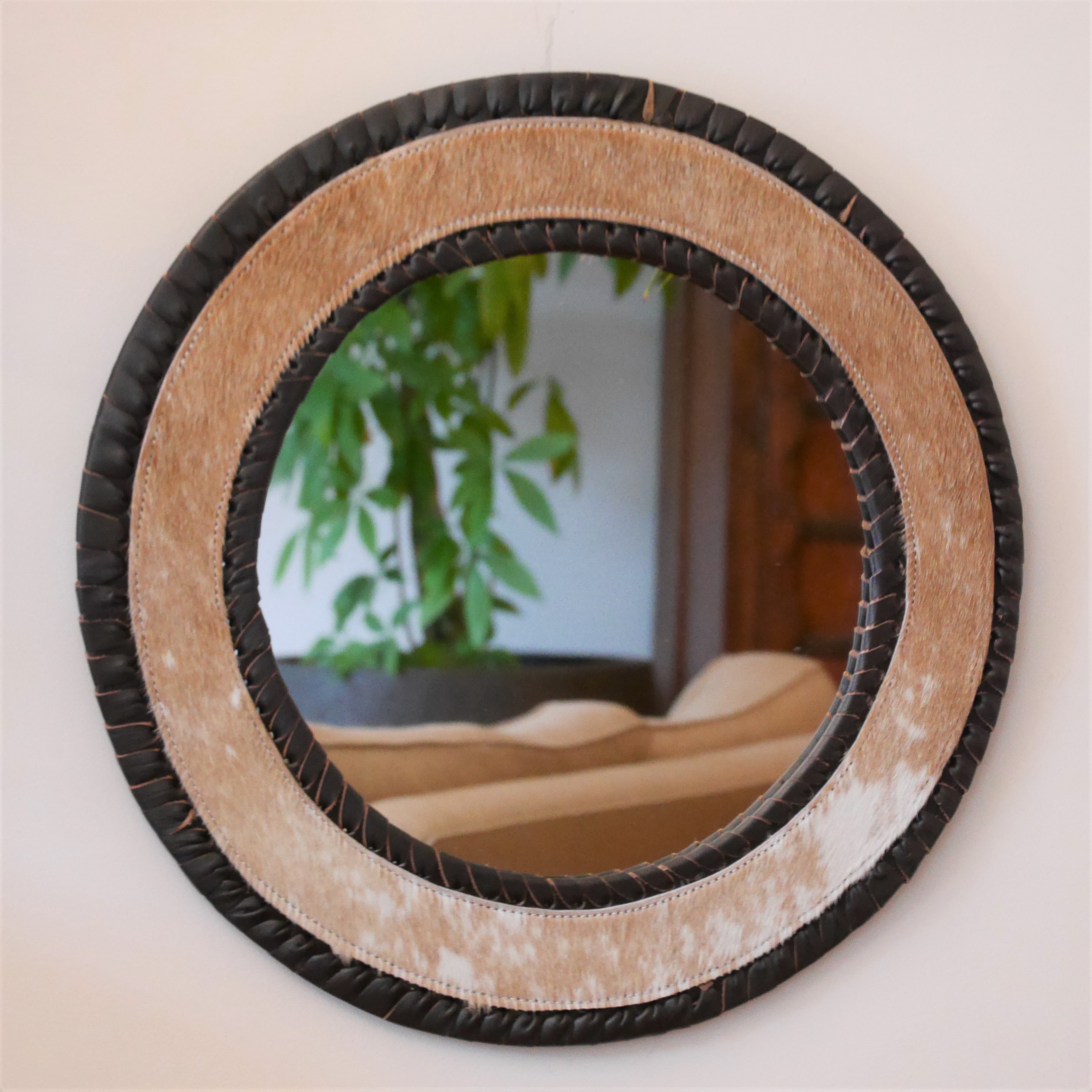 Artisanale ronde spiegel, ingelijst in een frame van natuurlijk leder met geknoopte randen.