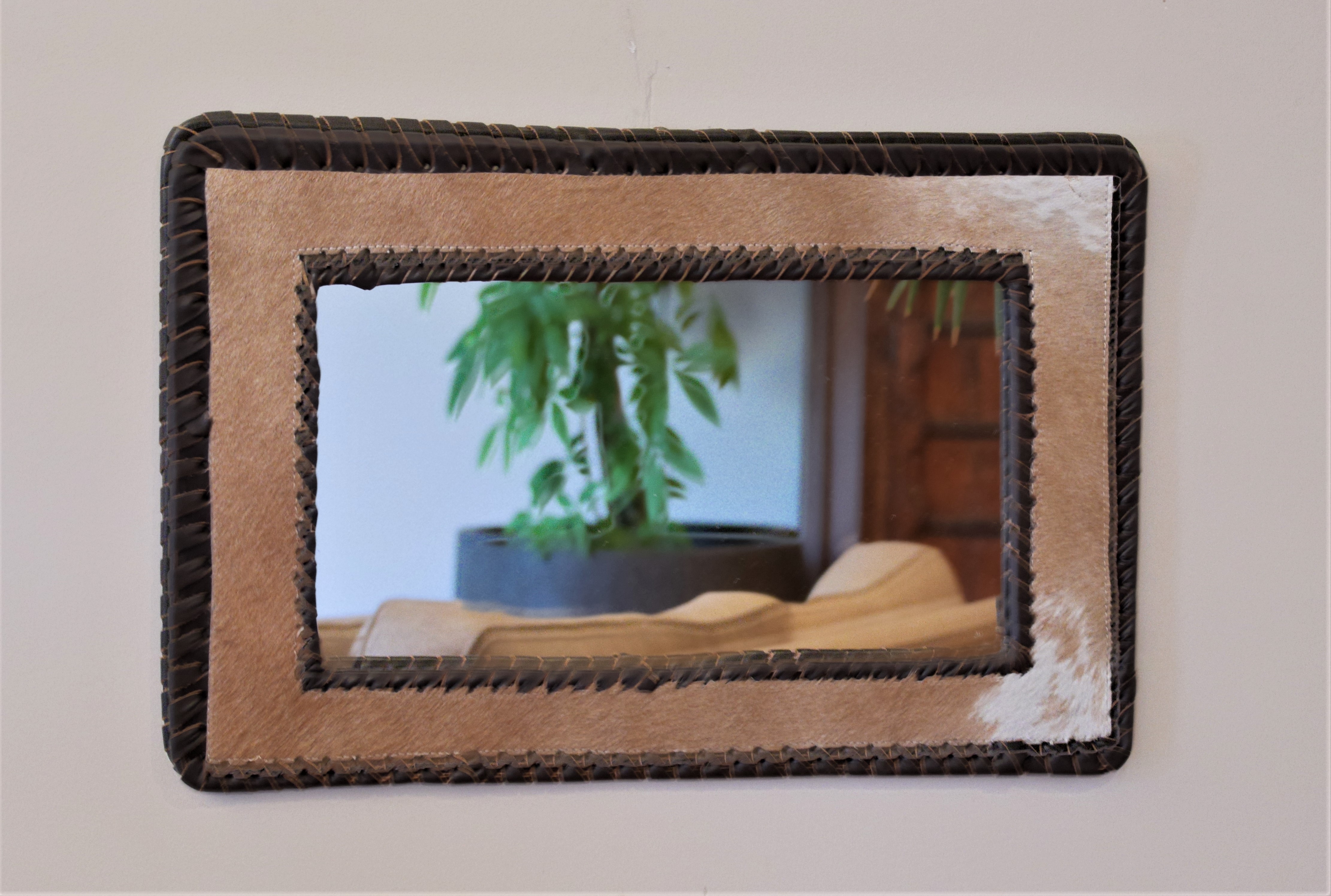 Artisanale rechthoekige spiegel, ingelijst in een frame van natuurlijk leder met geknoopte randen.